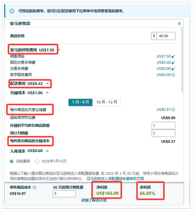 6、向下滑,可以看到亚马逊平台收取该产品的费用明细:销售佣金、尾程配送费、仓储成本等;还有入库区域、发货所收取的配置费和净利润。